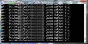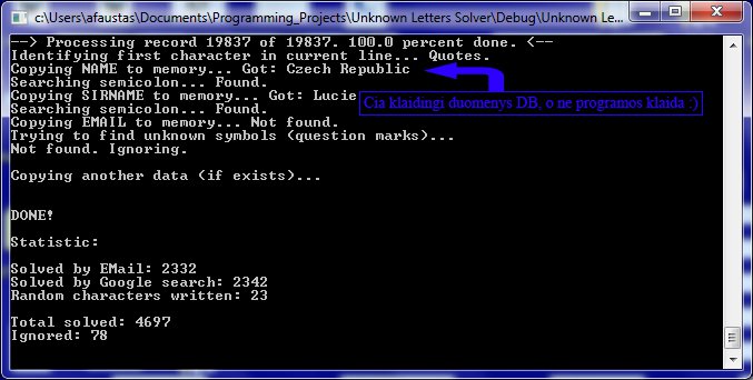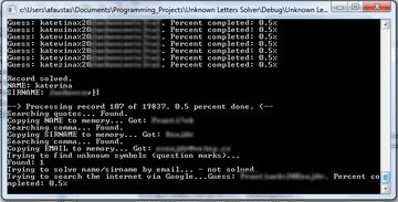 /* =========================================================== * PROGRAM: Unknown Letters Solver * VERSION: 1.04 * ----------------------------------------------------------- * DESCRIPTION: * Tekstineje (naud. ASCII ar UTF-8 koduote).csv duomenu baze- * je, kurioje surasyti vardai ir pavardes, programa suranda * irasus su trukstamais simboliais (jie turi buti pazymeti * '?'), ir juos bando nuspeti.Pradzioje speja pagal salia nu- * rodyta e-mail adresa, o tada bando ieskoti vardu/pavardziu * su spejamais simboliais internete (naudoja "Bing") ir kai * spejimo budu suranda daugiausia rezultatu, tai tas raides, * su kuriomis buvo suformuluota daugiausia rezultatu davusi * uzklausa, suraso i rezultatu faila. Jei niekaip nepavyksta * nieko rasti per "Bing",tai raides nuspejamos atsitiktinu- * mo budu. .CSV duomenu bazes struktura: * +-------------------------------------------------------+ * |"Vard?s";"Pavarde";"email@domain.com";"kiti";"duomenys"| <-- Source database should be in such format (csv file) * |"Vard?s";"Pav?rde";"";"kiti";"duomenys2" | * |"Vardas";"Pa??rde";"email@domain.com";"kiti";"duomenys"| * `~~~~~~~~~~~~~~~~~~~~~~~~~~~~~~~~~~~~~~~~~~~~~~~~~~~~~~~` * ,~~~~~~~~~~~~~~~~~~~~~~~~~~~~~~~~~~~~~~~~~~~~~~~~~~~~~~~, * |"Paskutinis";"Irasas";"invalid";"kiti";"duomenys" | * +-------------------------------------------------------+ * * .CSV DUOMENU BAZEJE NETURETU BUTI KLAIDU (PROGRAMA JAS TIK- * RINA, BET NEPAKANKAMAI).ESANT KLAIDAI PASEKMES NEPROGNOZUO- * JAMOS. * * ----> USE THIS PROGRAM AT YOUR OWN RISK! <---- * * ----------------------------------------------------------- * REVISION: * 1.0 - Initial version * 1.01 - Some bugfixes: * 1. Invalid references then solving UTF-8 data * 2. Improved error checking (but not completed yet!) * 3. Improved communication with "Bing" algorithm * 4. Added ability to enter how much questions try to * solve via "Bing". * * 1.02 - Some bugfixes: * 1. Fixed some major bugs in unknown letters solu- * tion by email address algorithm. * 2. Improved search via "Bing". * 1.03 - Improved accuracy of solution * 1.04 - 1. Changed search engine. Now this program uses * "Bing" because "Google" now don't allow automated * queues. * 2. Added ability to cancel conversion * 3. Now record solved by random are marked as RANDOM * in destination file. * * (P.S.: Sorry for my poor English.) * ----------------------------------------------------------- * (c)COPYLEFT 2010, Àþuolas - Faustas BAGDONAS * Programa leidziama visiems modifikuoti, tobulinti, taikyti * saviems tikslams. Tai tera Quick & Dirty versija, skirta * mano asmeninems poreikiams. * =========================================================== */